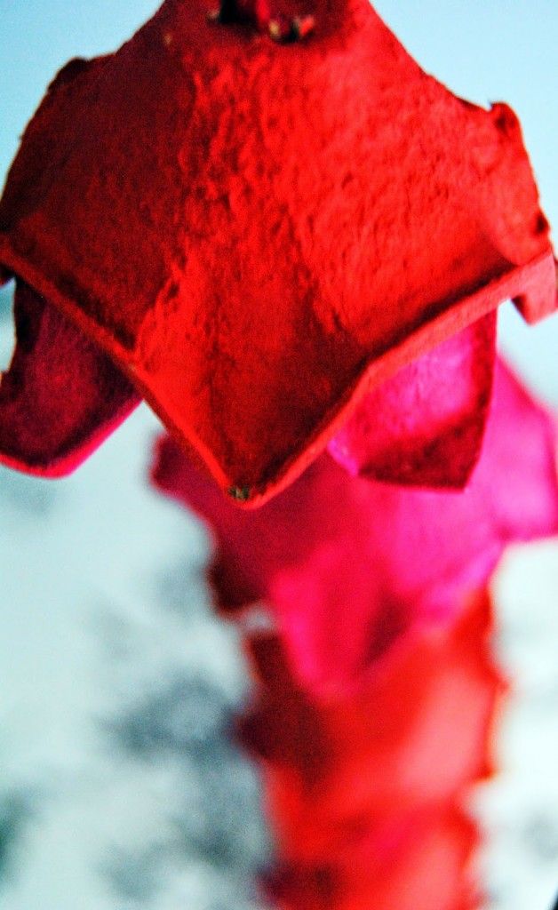 Cartones de huevos pintados en rojo y fucsia. |