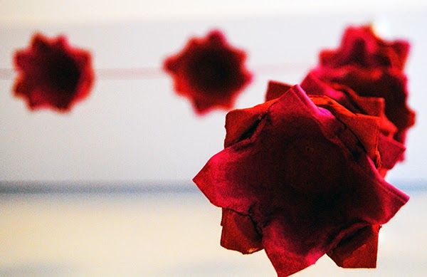 Con los cartones de huevos. Cada día me doy cuenta de nuevas cosas que se pueden hacer con ellos. Ya hice un pequeño zapatero para los tacones y ahora una guirnalda para la habitación.