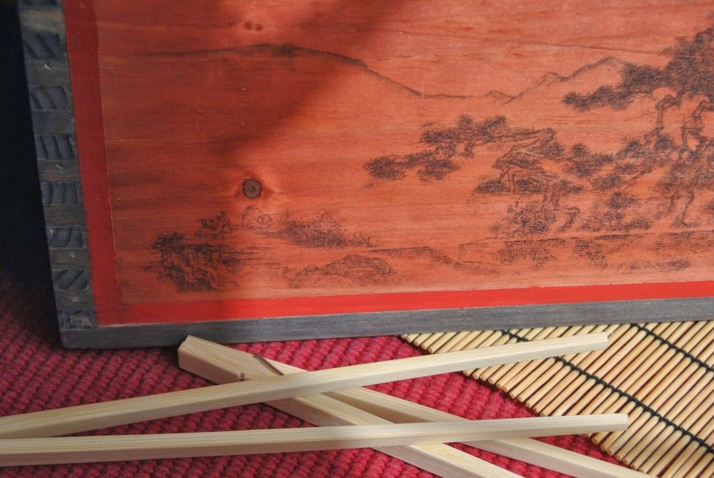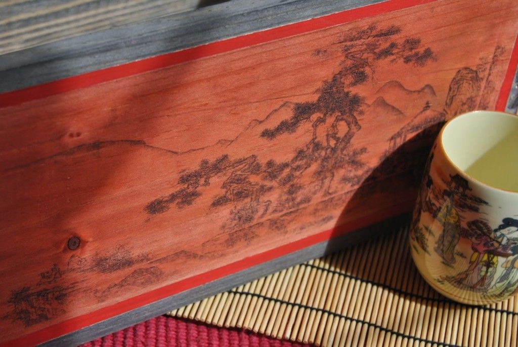 De rojo y negro he decidido hacer una caja para guardar todas las bolsas de té. Me gusta mucho Japón y su cultura, por lo que he elegido una imagen de un paisaje de ese país.