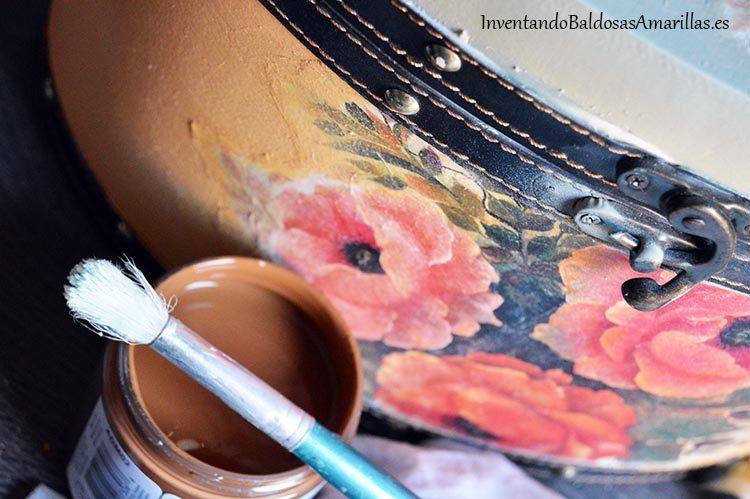 Damos una pátina con cera teñida de marrón para lograr un efecto envejecido. Aplicamos con brocha o pincel y enseguida difuminamos o matizamos con un trapo. Hay que tener cuidado porque mancha mucho.