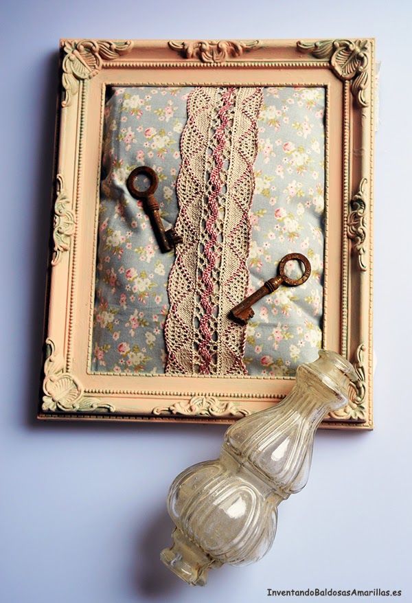 Este marco me parece de lo más shabby, los diseños Tilda son siempre muy románticos y la tela escogida, con esos tonos y florecillas, me parece divina. Las llaves, un tesorito!!