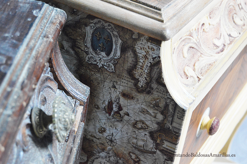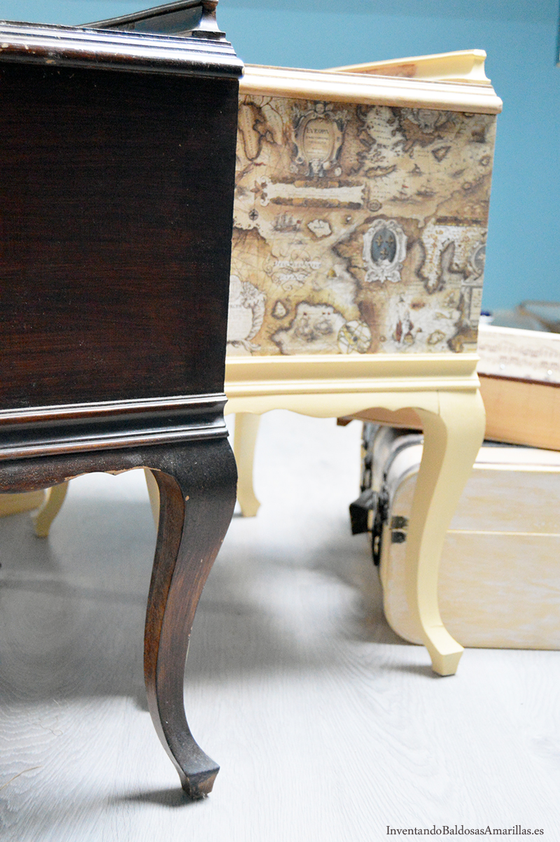 Y para los laterales, tenía que aportar algún detalle que fuera vintage, original y que dotara de personalidad a mis nuevas mesillas. Tenía varias alternativas, pero enseguida el papel de mapas antiguos me pareció que iba a casar perfectamente.
