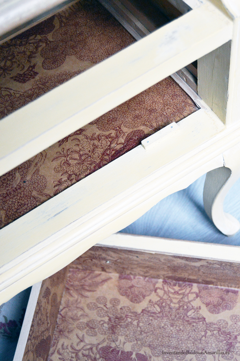 Sobre estas mesillas hice un post sobre los pasos que hay que seguir cuando te planteas cambiar el aspecto de un mueble. Antes de ponernos a pintar o pegar papel, tenemos que limpiar bien las superficies, mirar qué elementos pueden estar sueltos, como molduras o tiradores y retirar todo lo superfluo. Por cierto, si en algún momento os planteáis darle una segunda oportunidad a algún mueble viejo, pero tenéis dudas sobre si merece la pena, lo fundamental es mirar la estructura. Si tiene puertas y no encajan bien, si una de las partes laterales ha cedido y está descuadrado o si tiene muchos agujeritos pequeños en la madera, señal de carcoma, entonces, piénsalo bien. ¿Se puede arreglar? Sí, claro. Pero el trabajo que conlleva puede ser tanto que al final dejes la pieza a medias o no sepas exactamente cómo solucionarlo. En este caso, con estas mesillas, sabía que había mucho trabajo detrás, pero la estructura era buena y sobretodo me gustaba mucho la forma de las patas y los frentes de los cajones. Bueno, y que desde la estantería me estaban llamando por mi nombre!!!! Y no me pude resistir.