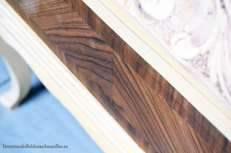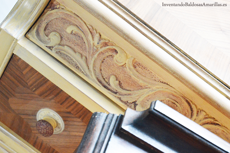 Para decorar el frente del cajón y el copete usé cera incolora teñida con tinte al alcohol de color caoba. La idea era darle un poco de profundidad a todo el relieve que tenían. Con la pintura de un sólo color pasaba desapercibida toda la decoración en forma de hoja.