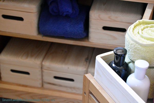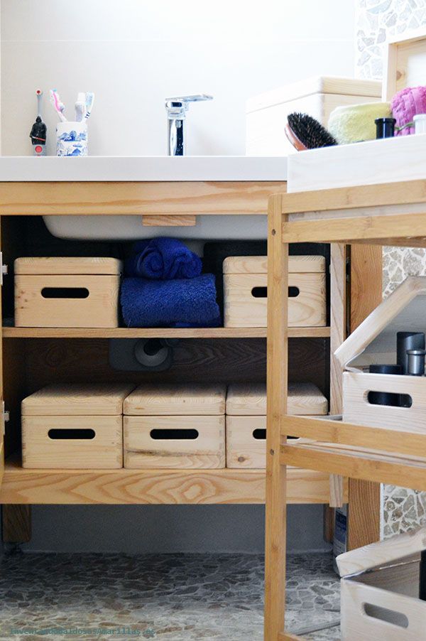 Siempre me han gustado los muebles del baño, que tienen espacio debajo para colocar cestas de madera o mimbre. Una variación sería utilizar cajas de madera para almacenar toallas, rollos de papel, botes de gel o colonia…