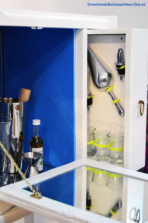 Junto a las vajillas de Deliving podemos encontrar propuestas que sorprenden por su originalidad. Si algo sencillo es capaz de sorprender, creo que no puedes dejarlo pasar. Hay que pararse y echar un buen vistazo. Como en este mueble-bar de color blanco. Una mesilla de madera, le damos la vuelta y usamos el cajón y la puerta para ordenar todo lo necesario para preparar una copa.
