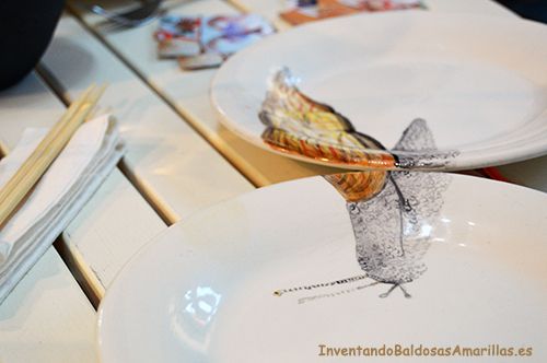 No dejamos la mesa porque las vajillas de Nuria Blanco se merecen otro ratito echando un ojo. Pintadas a mano, cada pieza es exclusiva, y a la vez cada plato es sólo una parte de un diseño en el que participan varios elementos. De esta forma, un caracol o un calamar nacen cuando juntamos dos platos.