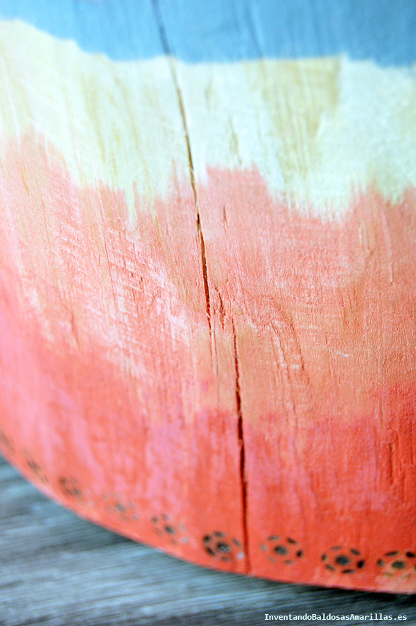 Hace unas semanas me escribieron de Lufe para proponerme un reto. Se trata de una empresa de muebles, que apuesta por una producción ecológica y que busca dar soluciones funcionales con sus diseños. Ellos me mandaban su último mueble y se supone que podía personalizarlo cómo quisiera. Todo sonaba genial. Muy fácil. Me parecía una idea fantástica. Poder hacer lo que quisiera con un mueble de madera sin tratar. De hecho, en cuanto me lo dijeron, en mi cabeza empezaron a rondar un montón de ideas. Pero cuando llegó a casa y lo vi, todo eran dudas. La madera era tan bonita, que ya no sabía qué hacer. ¿Lo dejo cómo está? Imposible. El reto era personalizarlo. ¿Lo pinto de un color? Noooooooo, que no se ven los dibujos de la madera. ¿Lo tiño? Tampoco, que puede ser demasiado. Así que me he pasado semanas echándole un ojo y pensando. El resultado es una mezcla un poco rara entre decoración étnica y degradado. El mueble se llama Tronco Lufe. Y su nombre no puede ser más descriptivo. Se llama así porque es un tronco que sirve como mesita auxiliar. En la parte de abajo lleva unas ruedas, que nos permiten poder moverlo con facilidad. Cuando vi la foto me parecía pequeño. Cuando mi tronco llegó a casa, entonces fui consciente de las verdaderas dimensiones. Una de las cosas que más me gustó fue poder tocarlo. La madera natural, sin barnices y sin ningún producto.