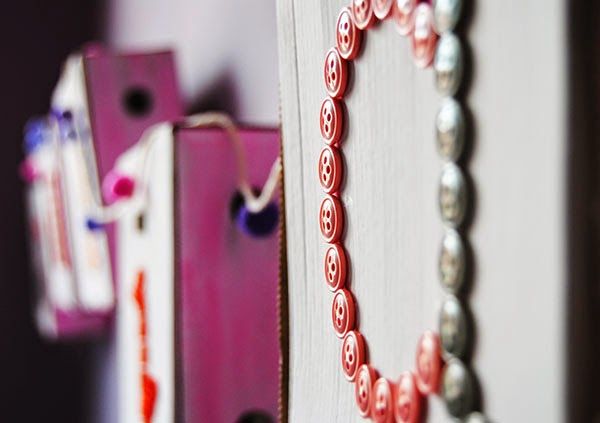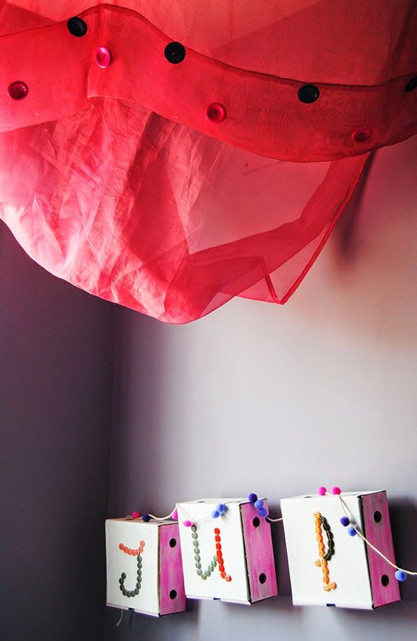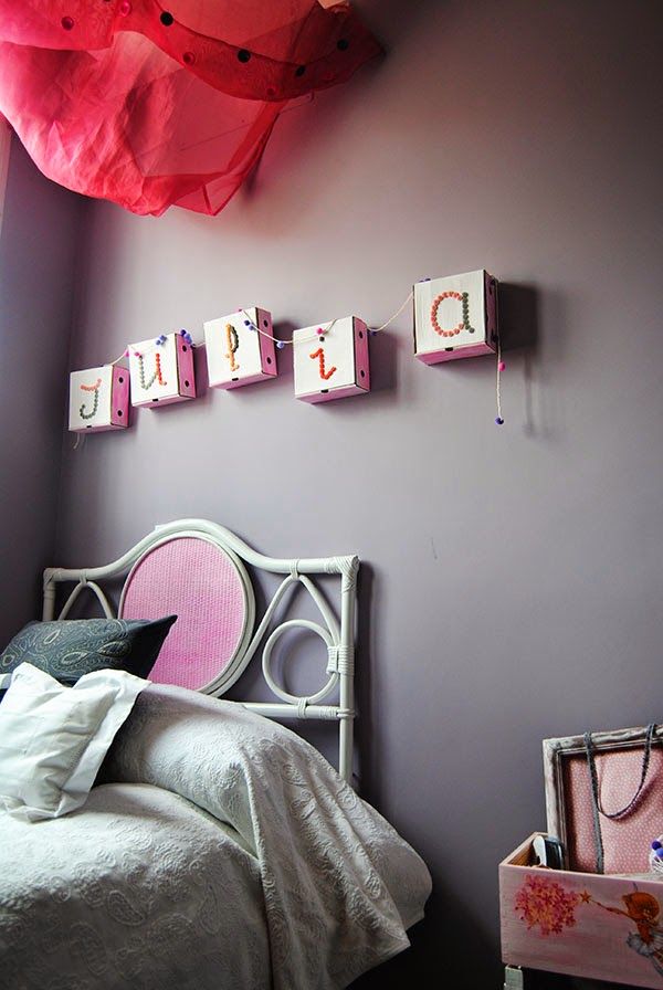 Sobre el cabecero, su nombre. Cajas de cartón recicladas con una manita de pintura y botones de colores. Para rematar una guirnalda de pompones.