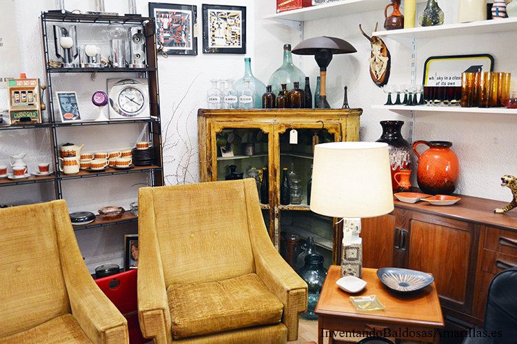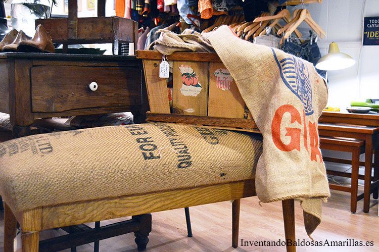 Muebles de los años 50, 60 y 70 en un perfecto estado de conservación conviven en esta tienda donde todo son estímulo para los ojos y los oídos. La madera es una de las grandes protagonistas que comprate espacio con la tela de saco. Sacos originales traidos desde el Reino Unido en algunos casos.