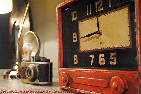 Para decorar nuestro rincón de lectura de estilo vintage buceamos para encontrar objetos que combinen con todos esos cajones. Aunque lo normal es que las horas pasen volando, si tenemos la suerte de encontrar uno de esos libros que enganchan, es recomendable mirar al reloj de vez en cuando. Por eso colocamos un reloj de color rojo (a juego con uno de los cajones del mueble) para no llegar tarde a nuestras citas.