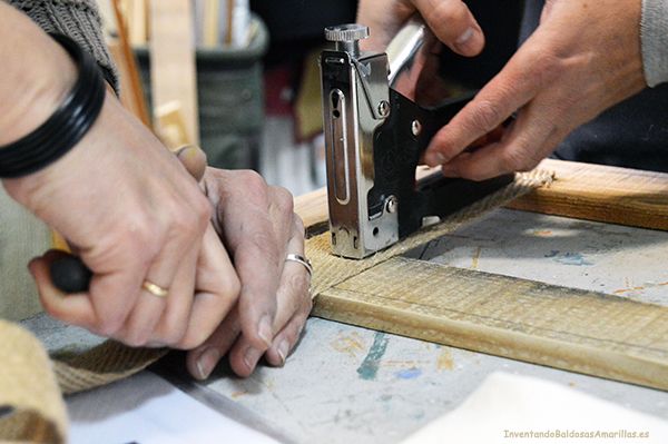 Lo primero para poder tapizar cualquier objeto es colocar las cinchas en la base. Con la ayuda de una grapadora fijamos las tiras a la madera.