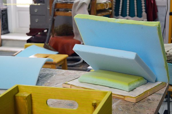 • Tapizado sobre madera: La base se construye con una tabla de madera, se pegan las espumas y se envuelve todo con guata. Os adelantamos un primer TRUCO: es importante cortar la espuma al borde justo de la madera mientras que la guata y la tela tienen que sobrar para poder dar la vuelta y grapar por la parte de atrás del tapizado.