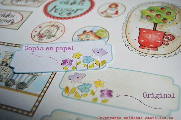He encontrado varias colecciones de PAPEL DE SCRAP que me han encantado. Tienen unos dibujos infantiles y vintage muy bonitos y desde que los vi supe que quería usarlos para algo. La gran pregunta: ¿Se puede usar el papel de scrap para transfer? No. Lo digo porque lo he intentando y es tan grueso que no funciona. No se queda bien pegado, de hecho, la imagen no se adhiere a la superficie y cuando tratamos de quitar la celulosa nos llevamos todo: el papel y el dibujo. Pero yo quería usar esos dibujos. Podría haber buscado otros en internet o comprar otro tipo de papel, pero la idea es ir adaptando las técnicas y buscar pequeños trucos para poder hacer lo que realmente queremos hacer. Así que hice una copia a color en folio de la lámina con efecto espejo (por cómo se hace el transfer con gel las imágenes y la letras se giran, por lo que al imprimir hay que darles la vuelta antes).